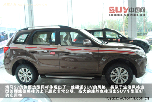 海馬S7的側(cè)面造型同樣體現(xiàn)出了一絲硬派SUV的風(fēng)格,類似于波浪風(fēng)格造型的腰線使整體的上下層次非常分明,高大的座艙也體現(xiàn)出SUV車型更好的實用性。