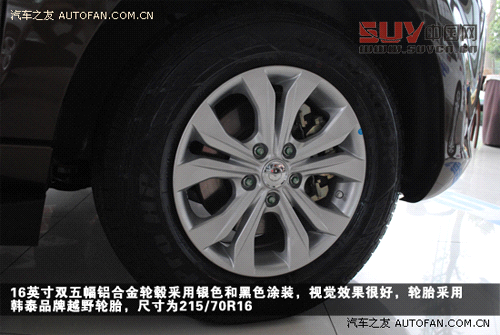 16英寸雙五幅鋁合金輪轂采用銀色和黑色涂裝,視覺效果很好,但是搭配碩大的車身,尺寸偏小,或許是為了突出越野車的氣質(zhì),輪胎采用韓泰品牌越野輪胎,尺寸為235/70R16,超高的扁平比在一定程度上提供了不錯的舒適性,并且行駛在惡劣路面時對輪胎起到了一定的保護(hù)作用。