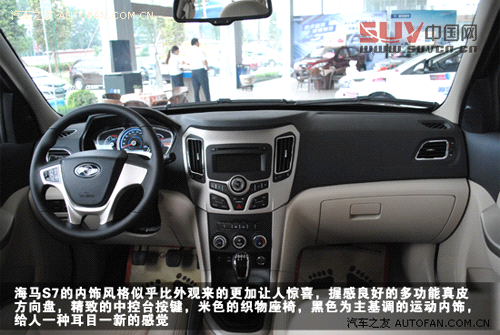 _ueditor_page_break_tag_海馬S7的內(nèi)飾風(fēng)格似乎比外觀來的更加讓人驚喜,握感良好的多功能真皮方向盤,精致的中控臺按鍵,米色的織物座椅,黑色為主基調(diào)的運(yùn)動內(nèi)飾,給人一種耳目一新的感覺。
