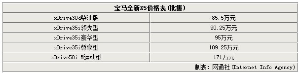 全新寶馬X5作為寶馬品牌今年在華引入的一款重要車型,繼去年亮相后,其將在今年2月正式引入國內市場。近日,記者社獲取了全新寶馬X5的批售價格(注:售價不含經銷商利潤,新車在上市后價格或將進一步上調)。從曝光的批售價格來看,寶馬X5柴油版車型定為85.5萬元,如果加上經銷商的利潤。預計寶馬入門級柴油車的正式售價或在90萬左右,這樣的價格將與奧迪Q7柴油版車型 35 TDI quattro(90.28萬元)相持平,這也預示著寶馬將與奧迪在柴油車領域展開一輪新的競爭。