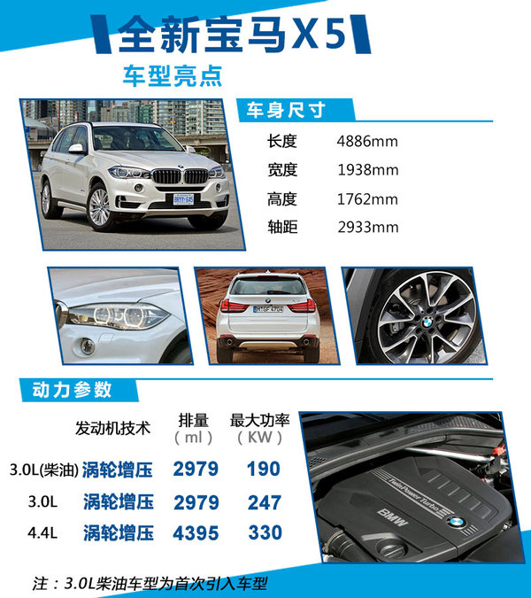 作為寶馬X5的換代車型,全新X5在動力上新增一款排量為3.0L的柴油版車型,其最大功率為190千瓦,峰值扭矩560牛米。另外在柴油車的基礎上,寶馬全新X5仍然搭載與現款相同的3.0T和4.4T汽油發動機,對應車型分別為xDrive35i和xDrive50i。但是相比現款車型,新車在動力上進一步提升。其中4.4T雙渦輪增壓發動機的最大功率可達330千瓦,峰值扭矩為650牛米(比現款分別高出30千瓦和50牛米)。