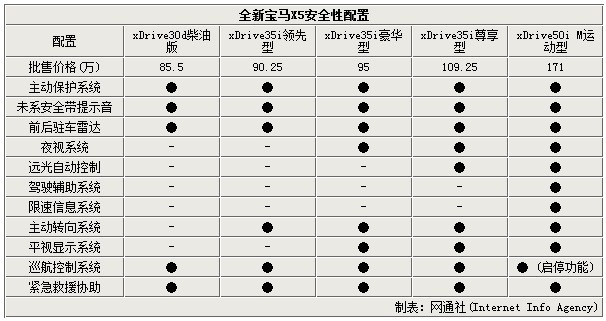 另外在安全性配置上,寶馬全新X5全系標配主動保護系統以及前后駐車雷達,并配備緊急救援協助系統。從上表中我們可以看出,寶馬全新X5在高配車型上還配備夜視系統、駕駛輔助系統、限速信息系統,全面的保護車內駕駛者與乘客的安全。