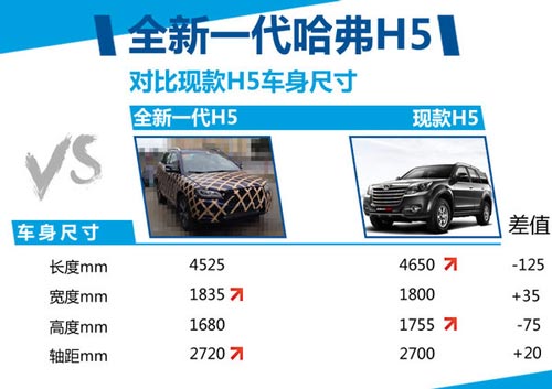 據了解,全新一代哈弗H5的車型定位從硬派SUV轉型為城市時尚SUV,不再采用非承載車身和后整體橋式懸掛,取而代之的是承載式車身和后雙橫臂式獨立懸掛。在車身尺寸方面,換代哈弗H5也進行了調整,長寬高分別為4525·1835·1680mm,軸距為2720mm。相比現款車型而言寬度和軸距有多所拓展,這將有效提升車內人員的乘坐空間。