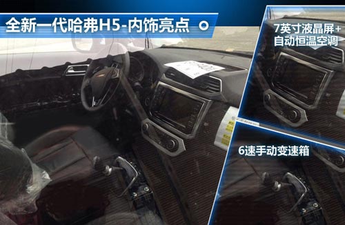 在車內配置上,雖然是一臺換代H5的試裝車,但是我們仍能看出該車擁有很高的配置。如真皮三幅式運動方向盤配有多功能按鍵、7英寸可觸式液晶屏、雙區自動恒溫空調、真皮座椅、6速手動變速箱等,這些配置在這款緊湊SUV車型將具有絕對的競爭力。