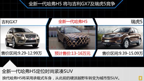 由于全新一代哈弗H5的車型定位有所改變,待這該車上市后,將不再與硬派越野車競爭,轉而形成與奇瑞瑞虎5、吉利GX7等車型對標,以搶占國內熱銷的城市SUV細分市場。同時在哈弗品牌緊湊SUV的產品進行重新布局,進一步提升品牌的影響力。