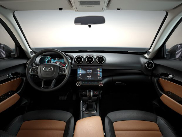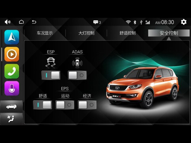內飾方面,新車采用了黑色的主題,在門板、座椅等處還采用了棕色的裝飾。新車的中控臺使用了一塊由蘋果供應商提供的10.1寸電容觸摸屏,儀表臺使用7寸非觸摸液晶屏,整體提升了科技感。此外新車還配備有真皮方向盤、iCar 1.0智能互聯系統、ESP、駕駛模式選擇等功能。