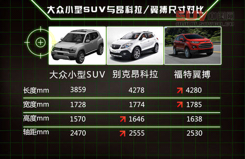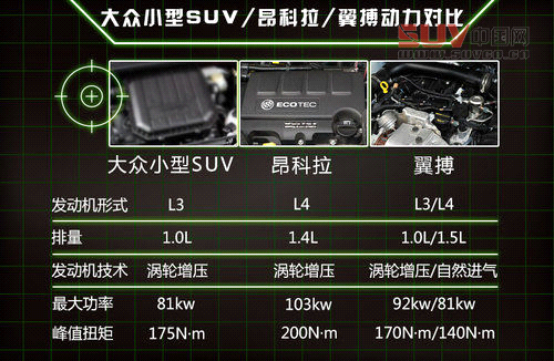 大眾小型SUV在車身尺寸上與別克昂科拉和福特翼搏相比更加“袖珍”,不過在車重上比兩大競爭對手分別輕了約500kg和300kg。發(fā)動(dòng)機(jī)方面,隨著小排量增壓引擎在燃油經(jīng)濟(jì)性上優(yōu)勢較明顯,大眾小型SUV也將順應(yīng)這個(gè)趨勢搭載一臺(tái)小排量的1.0TSI引擎,參數(shù)相比福特翼搏所使用的1.0T發(fā)動(dòng)機(jī),功率相差11kw,扭矩超出5N·m。