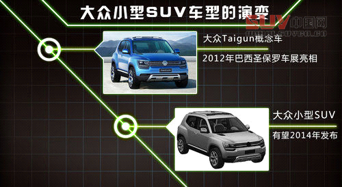 2012年10月23日,Taigun概念車正式亮相巴西圣保羅車展,這也是大眾未來小型SUV的發(fā)展方向。網(wǎng)通社了解到,大眾將推出的小型SUV正是以這款概念車為設(shè)計(jì)藍(lán)本,有望在2014年發(fā)布,海外版預(yù)計(jì)售價(jià)9000歐元,約合人民幣7.3萬元左右。