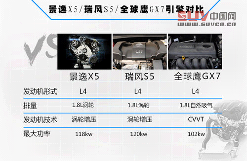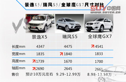 景逸X5上市后,將與江淮瑞風S5和全球鷹GX7等車型競爭,尺寸方面,新車在高度和軸距上均超越了競爭對手。發動機方面,景逸X5搭載的1.8L渦輪增壓發動機,功率與瑞風S5不相伯仲。據悉,新車上市后,售價預計會在10萬元左右。
