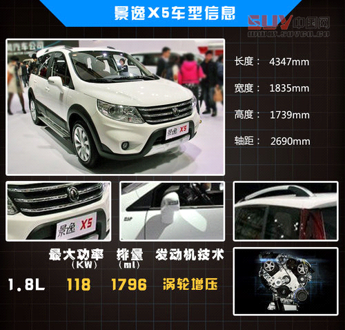 景逸X5的長寬高分別為4347/1835/1739mm,軸距2690mm。新車所搭載的發動機由上汽集團提供,此外,除榮威W5外,現款景逸SUV同樣也使用該款發動機。