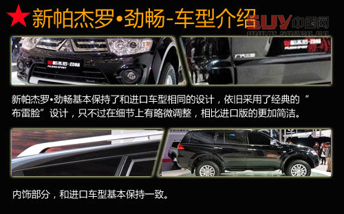 國產新帕杰羅•勁暢的在造型上基本保持了和進口車型相同的設計,依舊采用經典“布雷臉”設計。只不過在細節上有略微調整,前臉中網區為鍍鉻雙橫條,同原進口車型的鍍鉻斜向直條設計不同,保險杠下方采用了黑色護板,相比進口版的更加簡潔;內飾部分和進口車型基本保持一致。