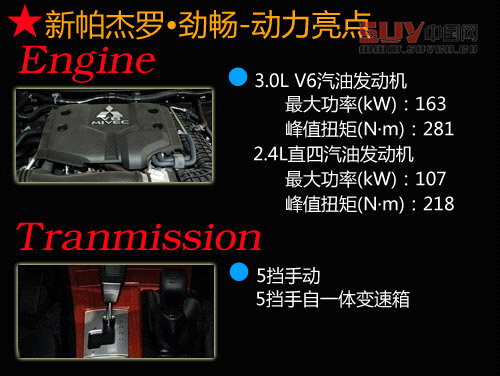 新帕杰羅•勁暢的外觀的變化不大,改動將主要集中在動力和配置方面。在動力方面,國產帕杰羅•勁暢將搭載與進口版本相同代號6B31的三菱3.0L V6汽油發動機,該發動機發動機最大輸出功率可達163kW,峰值扭矩為281N•m;還將搭載代號4G64的2.4L直四汽油發動機,最大功率為107kW,峰值扭矩為218N•m。與之匹配5擋手動或5擋手自一體變速箱。此外,國產新帕杰羅•勁暢還將增加兩驅版低配車型,預計新帕杰羅•勁暢在售價上相比進口車型的降幅會有較大的空間。