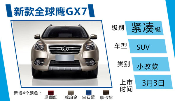 新款GX7在前臉造型上將有小幅改動,值得一提的是,新款GX7新增了珊瑚紅、琥珀金、寶石藍和摩卡棕四種顏色,加上現(xiàn)有的3種,屆時將有7種色調(diào) 供消費者選擇。動力方面,新款GX7與現(xiàn)款保持不變,仍將搭載1.8L、2.0L和2.4L三款發(fā)動機,與發(fā)動機匹配的是5速手動或6速手自一體變速箱。新款GX7相比老款增加S運動擋是其一大亮點,運動性能進一步提升的同時,還為駕駛員提供全新的駕駛樂趣。