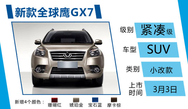 新款GX7在前臉造型上將有小幅改動,進氣格柵由長方形變為倒梯字形,前燈組和霧燈也進行重新設計。同時為形成前后呼應的設計,尾燈組也進行大刀闊斧的調 整,采用了全新豎狀的尾燈組設計。值得一提的是,新款GX7新增了珊瑚紅、琥珀金、寶石藍和摩卡棕四種顏色,加上現有的3種,屆時將有7種色調 供消費者選擇。