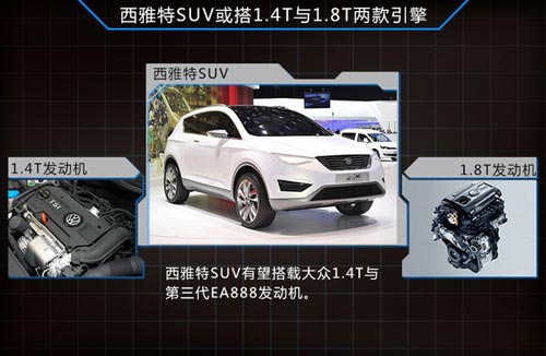 由于與斯柯達YETI與途觀采用相同平臺生產,未來西雅特首款SUV與Yeti有望共享動力總成。據了解,西雅特的首款SUV有望搭載與高爾夫相同的大眾1.4T引擎,這款發動機分為高低功率兩個版本,最大功率分別為96千瓦和110千瓦。此外車輛還有望使用大眾集團全新的第三代EA888發動機,該引擎在現有基礎上動力進行全面提升,其中1.8T發動機最大功率為125千瓦,峰值扭矩可達到320牛米。