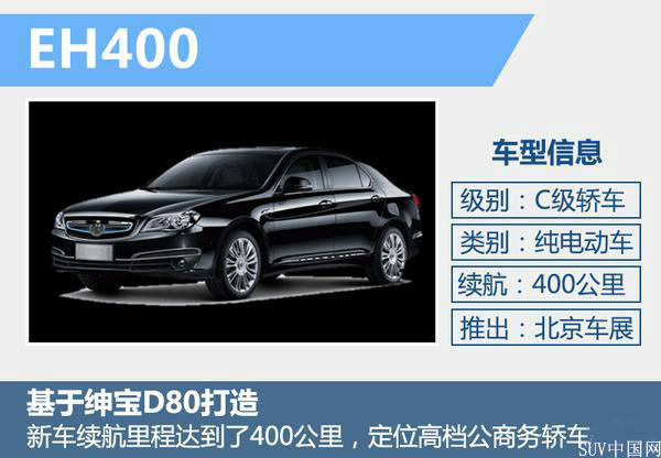 EH400基于紳寶D80打造,車身長度將達4946毫米,軸距為2830毫米,定位C級高檔公商務轎車,最高續航里程可達到400公里。新車外觀與現款汽油版D80保持一致,視覺效果依舊大氣穩重,前臉LOGO后方隱藏著電動車特有的充電接口。動力方面,新車搭載了永磁同步電機和改進的三元鋰電池技術,進一步提高了電池工作的高效率,降低不必要的能量損耗。與電動機匹配的是電動車單速變速箱,并采用旋鈕式換擋結構。