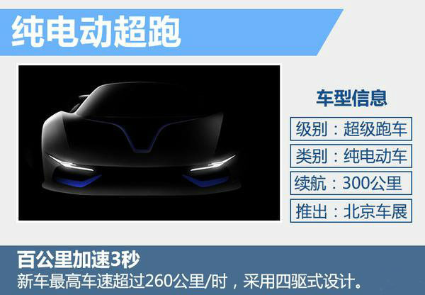 北京新能源汽車股份有限公司總經理鄭剛鄭剛此前在談及這款超跑時表示:“從我現在看到的技術數據看,這部車的加速性能實在是令人驚喜,將完全顛覆人們對電動車運動性能的想象。”新車將由北汽新能源西班牙巴塞羅那研發中心精密調教,定位高性能運動轎車,0-100公里/時的加速時間僅為3秒,續航里程可達到300公里,最高時速超過260公里/時。此外新車預計將在整車架構、輕量化、電驅動方面應用較為先進的技術。