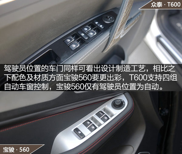 在工藝方面兩款車總體來說都是很爭氣的,從用料上考量T600的材質無論是賣相還是手感都要顯得檔次更高,細節處理得更細致一些,而寶駿560在這方面的處理不夠徹底,硬質材料會更多一些。當然,相對于這些小細節的差異,配置上的差異還是比較明顯的。