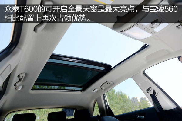同樣T600的全景天窗機構也一定程度上降低了車頂的空間,雖然寶駿560頭部空間的表現要優于眾泰T600但相比之下T600可開啟式全景天窗的設計會更討消費者的青睞,所體現出T600的配置要更高一籌。