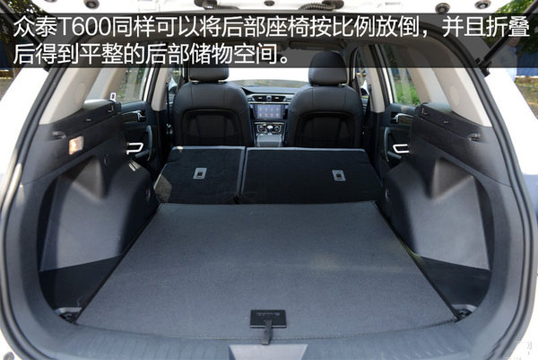 后備箱的空間使用率上,兩款車型都表現出了不錯的表現。兩款車全都支持后排座椅4/6比例放倒,且有極為平整的后部儲藏空間。寶駿560采用了折疊后排坐墊來為后靠背擴容收納空間,這也是比較聰明的做法。眾泰T600選用了直接將后靠背收起折疊的方式,操作相對更簡便一些。