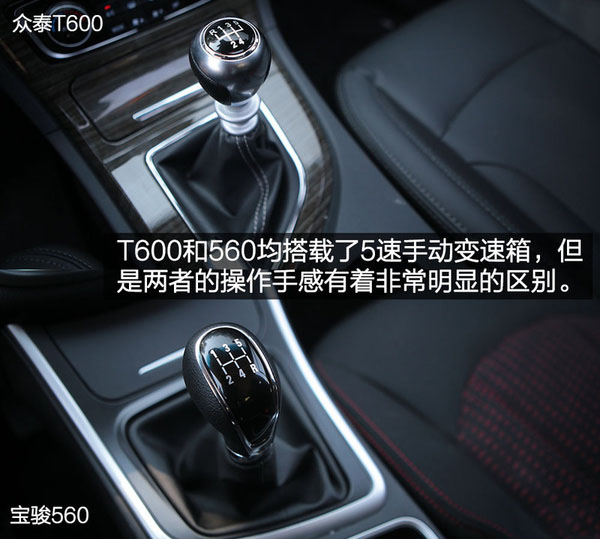 變速箱方面,雖然我們這兩臺試駕車都搭載了5速手動擋變速箱,而且兩者的手感卻有著非常明顯的區別。寶駿560擋位的行程比較長,入擋感比較綿緩,很柔;相比之下,T600的行程要短一些,而且擋位很緊,入擋感更剛硬,更干脆。