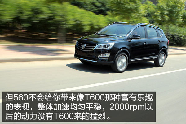 相比T600略帶出彩兒的動力表現,寶駿560則顯得有些過于平淡乏味了。1.8L自然吸氣發動機雖然可以倚仗排量的優勢,在低速起步時能表現出比T600更有勁道的動力響應,但是這種優勢也只局限于2000rpm以下,可以說也就是起步的一瞬間,而當T600真正進入爆發狀態之后,560的提速感則顯得遜色了不少。