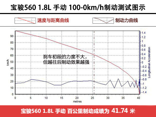 由于懸掛調校更軟,所以560剎車時的車身姿態沒有T600保持得好,尾部翹起幅度比較大。制動初段感覺力度沒有T600強勁,直到中段剎車力度有所增強,車速的驟降也明顯更快。雖然560的剎車狀態沒有T600穩定,但是由于裝配了馬牌輪胎,所以成績要比T600略好,不過兩車也基本上都處于同一個水平線上。
