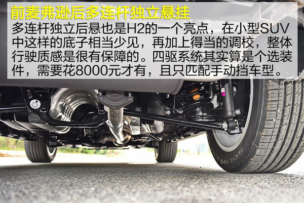 哈弗H2的動力輸出組成中規(guī)中矩,表現(xiàn)平平,日常使用絕對足夠。而在底盤方面,哈弗H2使用了多連桿后獨立懸掛,這還是不怎么常見的。雖然支撐力度不是很足,但是相比其他小型SUV,已經(jīng)是十分優(yōu)秀了。
