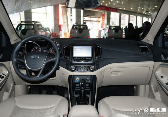 內飾上,瑞虎5的內飾設計風格與外觀很統一,樸實大氣,沒有過多的裝飾,簡潔的雙色內飾配飾很符合一般家庭用車的氛圍。中控臺全部為硬質材料,但各方面的做工都很精細;四輻方向盤尺寸合適,握感上算不錯,多功能按鍵布局合理使用方便;全系標配了7英寸液晶屏,分辨率較高,反應速度也不錯,各類功能按鈕分類清晰,手感很好。