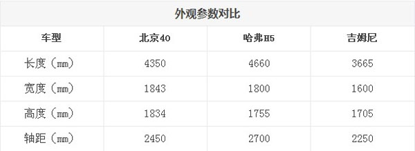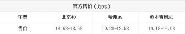 從性能劃分以及售價區間兩方面,我們此次為北京40找到了兩款競爭對手,分別是哈弗H5與鈴木吉姆尼,這兩者一個是老牌自主“越野標桿”而另一個則是在玩家中有口皆碑的“越野精靈”,而恰好與北京40有著共同的特點就是售價都在15萬區間左右。