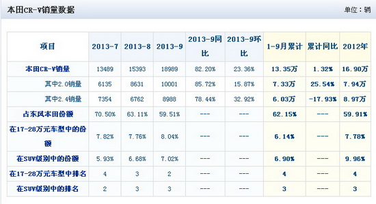 從上面的銷售表格數(shù)據(jù)中可以看到,2012年本田CR-V車型售出了16.9萬輛,而在今年新款車型的銷量數(shù)值也在逐級攀升,截止到9月份,這一數(shù)量已經(jīng)達到18989,很有沖進2萬輛的勢頭。另外,搜狐汽車行情編輯們了解到,目前該車型還有一定程度優(yōu)惠,詳情請點擊《本田CR-V現(xiàn)金降1.3萬元 最低售18.08萬元》進行查看。