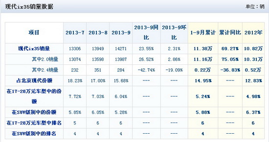 從銷售表格數(shù)據(jù)中可以看到,2012年現(xiàn)代ix35車型售出了10.82萬輛,這讓韓系SUV車型在國內(nèi)市場打了一個漂亮的翻身仗,而在今年新款車型的銷量情況也同樣喜人,截止到9月份,這一數(shù)量已經(jīng)達到14271。另外,搜狐汽車行情編輯們了解到,目前該車型還有相當程度的優(yōu)惠,詳情請點擊《現(xiàn)代ix35現(xiàn)金優(yōu)惠2.85萬!最低售18.53萬》進行查看。