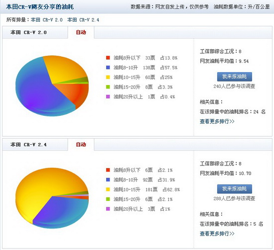 對于油耗分析方面,需要說明的是針對本文的四款車型,我們均主要對大家關注度較高的自動擋車型進行分析計算。例如本田CR-V,通過調(diào)查得知2.0L自動擋車型的網(wǎng)友實際油耗平均值為:9.54L,2.4L車型的數(shù)據(jù)則要相對較高一些,達到了10.70L。這樣一來,兩款車型在六萬公里保修期內(nèi)的油耗分別為:5724L和6042L,如果按照目前北京油價計算的話,2.0L車型在六萬公里內(nèi)的油費是5724*7.81=44704.44元;而2.4L車型的總費用則是6042*7.81=47188.02元。
