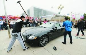 去年第12屆青島國際車展開幕現場,一輛價值260萬的黑色瑪莎拉蒂總裁停在會展中心南門外廣場,四名男子手持鐵錘砸向這輛瑪莎拉蒂。車主表示,福日集團下屬歐利行車行修車時舊件當成新件來用,車行經理承認錯誤行為,但數月來一直沒有解決問題,車主才會在車展上砸車。