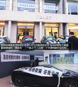 2013年11月,微博用戶高偉然007爆料稱,其今年3月在天津花費520余萬元購買的法拉利458 Spider車型可能是“事故車”。而購車時自己不僅毫不知情,甚至還付了新車的價錢,將一臺有可能被噴漆乃至有可能發生過事故的458 Spider買了回來,多次協商未果后一怒之下占領了這輛車的銷售店面,并掛出標語橫幅抗議,同時發布微博誓稱要維權到底。