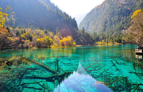 在九寨溝,你甚至分不清哪里是山,哪里是水,哪里是路!這里的水清澈見底,連水中的樹枝都看得一清二楚,湖面平靜,一不小心就會踏錯哦~