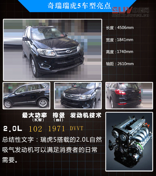 在動(dòng)力上,瑞虎5搭載了一款2.0L自然吸氣發(fā)動(dòng)機(jī),與現(xiàn)款瑞虎的2.0L引擎相同,其先期上市將匹配5速手動(dòng)變速器,在上市后其還將會搭載CVT變速器,給予消費(fèi)者更多的便捷,同時(shí)也豐富了瑞虎5的產(chǎn)品系列。