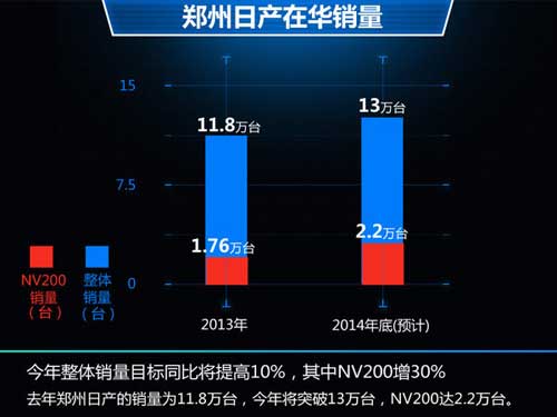 鄭州日產NV200一直是鄭州日產力推的CDV(從轎車平臺上延伸出來的廂式車)車型,其新款NV200也已于2月26日正式上市,共推出了包括加載智能XTRONIC CVT無級變速系統的NISSAN NV200+ CVT車型在內的八款新車型,售價區間為10.48-13.98萬元。由于新車搭載的全新一代HR16DE引擎及XTRONIC CVT全新智能無級變速系統等亮點,郭紅軍對其在未來的市場表現也抱有較高的期望:新NV200在2014年的銷量目標最少將達2.2萬輛,同比增長30%。屆時,鄭州日產的整體銷量也將隨著這一主力車型的銷量得到相應提升,增長率將達10%。