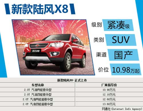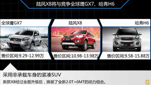 目前國內眾多自主品牌SUV都已相繼推出搭載增壓發動機的車型,陸風汽車也開始實現全面增壓化。在推出搭載2.0T發動機的新款陸風X8后,該車會與奇瑞瑞虎、哈弗H6等目前市場中熱銷的SUV車型競爭。