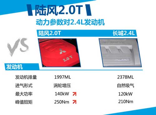 新款陸風X8最大的變化便是新增了2.0T的汽油增壓發動機,該車也是繼X5車型之后,第二款搭載2.0T汽油增壓發動機的車型。據悉,這款2.0T引擎為沈陽航天三菱汽車發動機制造公司提供,最大功率可達140kW,峰值扭矩為250Nm。動力性能可媲美傳統2.4L自然吸氣發動機,與大眾知名的2.0TSI發動機不相上下。