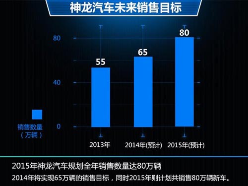 2012年神龍汽車取得了全年45萬輛的銷售業(yè)績,實現(xiàn)了大幅增長。良好的銷售情況也提升了其對于未來國內(nèi)市場的信心,并正式公布了“三年倍增計劃”,旨在促使2015年的汽車銷量比2012年翻一番。2013年該公司共售出55萬輛新車,超額完成了既定目標。今年公司的銷售目標為65萬輛,到2015年,將達到80萬輛的年銷售量。