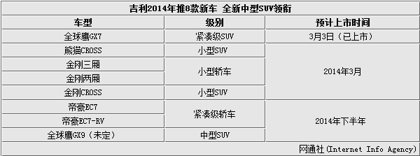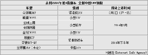 根據吉利汽車發布的公告,2013年其全年總銷量為54.9萬輛,較2012年增長14%。公司今年的目標銷量是58萬輛,較去年增長約6%。相比之下,吉利今年新車的投放力度則更為強勁。近日,吉利旗下主力車型全球鷹GX7的2014款在海南正式發布上市,然而這僅僅只是一個開始。對于今年的新車計劃,吉利控股集團有限公司公關總監楊學良近日在接受記者采訪時表示:“今年,吉利將推出8款新車,包括一款比GX7更大的SUV,有望于今年下半年上市銷售”。這意味著,除了剛上市的新款GX7,今年吉利還將有7款新車將上市。