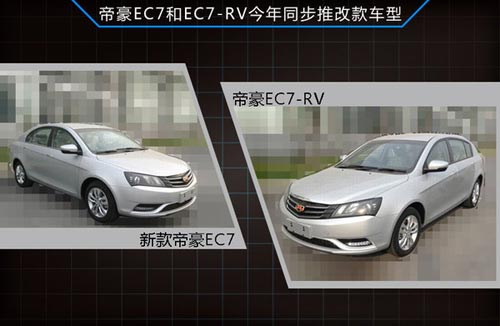 吉利去年的銷售冠軍帝豪EC7今年也將推出改款車型。新車在外觀上有較大改變,加入了時下流行元素,增加了LED日間行車燈。此外該車還配備了一款1.3T渦輪增壓引擎,這也使其成為吉利旗下首款搭載渦輪增壓發動機的車型。與現款搭載的1.5L/1.8L自然吸氣發動機相比,1.3T增壓發動機的動力性更強。98kW的最大功率將讓其在同級別車中更具競爭優勢。此外,帝豪EC7的兄弟車型EC7-RV今年也將同步推出改款車型。
