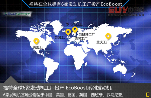 福特全球共有6家發(fā)動機(jī)基地分別投產(chǎn)EcoBoost系列發(fā)動機(jī),其中位于美國俄亥俄州克利夫蘭工廠將用以生產(chǎn)V6 EcoBoost發(fā)動機(jī),位于英國布里真德工廠和西班牙巴倫西亞工廠則投產(chǎn)1.6L和2.0L EcoBoost發(fā)動機(jī),1.0L和1.5L EcoBoost發(fā)動機(jī)在德國福特科隆工廠和羅馬尼亞克拉約瓦工廠打造,目前位于中國重慶的長安福特第一發(fā)動機(jī)廠便生產(chǎn)2.0L EcoBoost發(fā)動機(jī)。