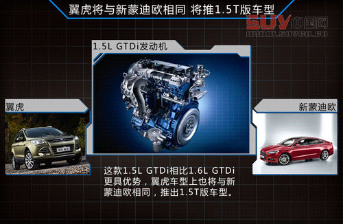 目前翼虎車型上所搭載的1.6L GTDi與即將上市的新蒙迪歐所搭載的1.5L GTDi相比,動力性能略遜于后者,1.5L GTDi還因低排量的因素,令其在消費(fèi)稅上相比1.6L GTDi要降低2%,節(jié)省近2,000元稅費(fèi),這也使得這款發(fā)動機(jī)更加適合中國市場。此外由于兩款車型目前的動力系統(tǒng)均是匹配的6速手自一體變速箱。