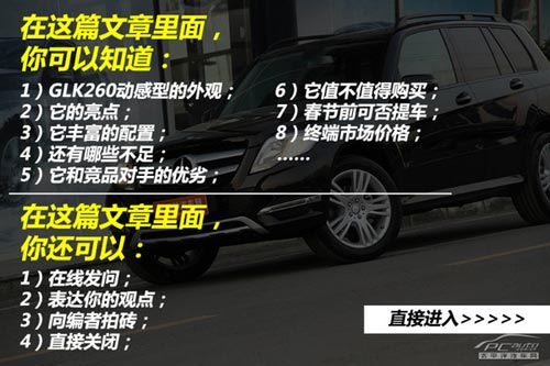 這是一個很現實的問題,不過GLK300動感型的超低價已經成為歷史。從渠道獲悉,目前GLK300動感型已經在全國出現缺車,由于無法提供具體提車時間所以不接受預訂等等。所以,我們有理由相信,GLK260的出現,很有可能是取代GLK300低配的位置。從而形成一個更豐富的產品線。
