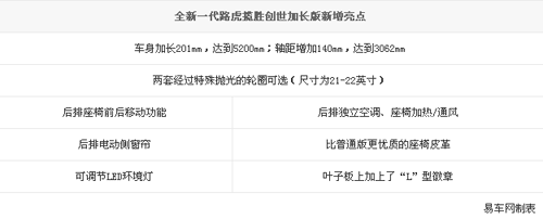 首先來(lái)看看全新一代路虎攬勝創(chuàng)世加長(zhǎng)版相比普通版本都增加了哪些亮點(diǎn)的配置: