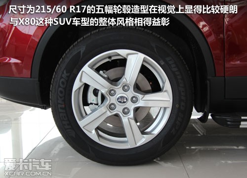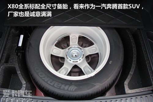 奔騰X80全系均配備了主要針對城市道路設(shè)計的韓泰達奈普系列輪胎,規(guī)格均為215/60 R17,市場售價約為750元/條,五輻式輪轂造型看上去簡單新穎。另外,奔騰X80采用的是全尺寸備胎,表現(xiàn)比較厚道。
