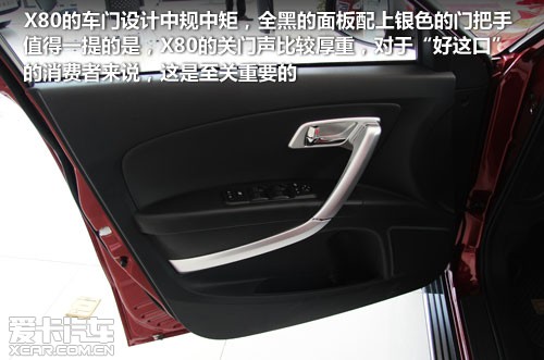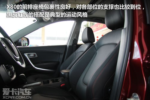 X80的前排座椅包裹性良好,黑皮紅線的搭配是典型的運動風格,而且前排座椅為電動調(diào)節(jié),使用起來也很方便。
