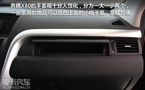 從空間上來說,奔騰X80車內(nèi)也有不少的空間用來放置物品,在車門兩側(cè)都有放置水杯的圓形儲物格,另外手套箱分上下一大一小兩個,一些常用的物品可以放在上面的小格子里,拿取方便。